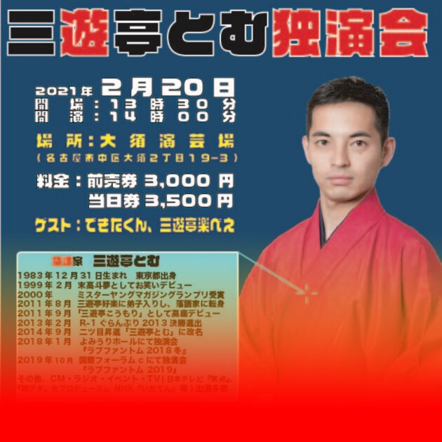 落語家 三遊亭とむの独演会を配信でお届けします!!