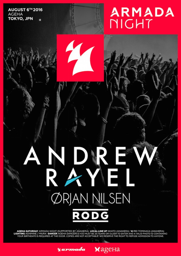 Armada MusicからレーベルのトップアーティストでありDJ MAG TOP 100 自身最高位 24位のAndrew Rayelと自身最高位 32位のOrjan Nilsen、さらにArmada Musicの次世代を担う秘蔵っ子Rodgの3組のアーティストが全員初来日の超豪華パーティー開催!