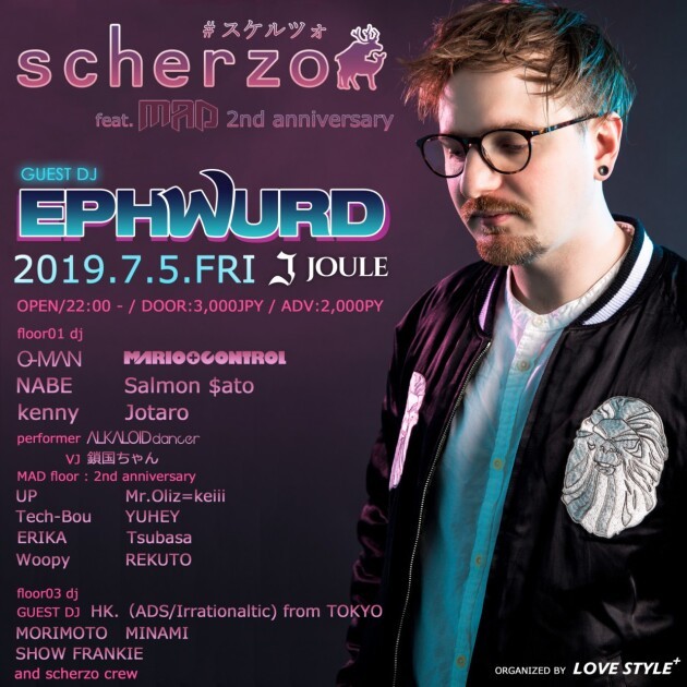 BASS HOUSEからTECH HOUSE、TECHNOまで最新のサウンドを追い求めながら、ファッショナブルですこし不良っぽく、悪ふざけしながら溜まれる場所をコンセプトをテーマにスタートするこのパーティー「scherzo」(スケルツォ)。