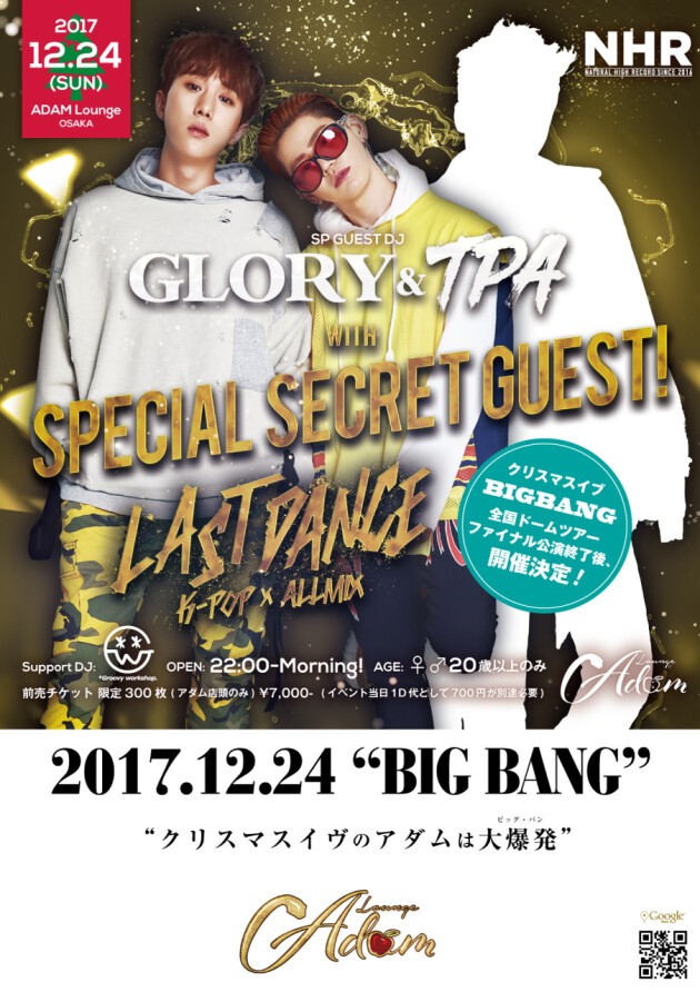 12月24日(日)京セラドーム大阪・BIGBANGドームツアー最終公演日に、NHR(Natural High Record)から、新進気鋭の若手韓流DJ”GLORY & TPA”がアダムに初登場!