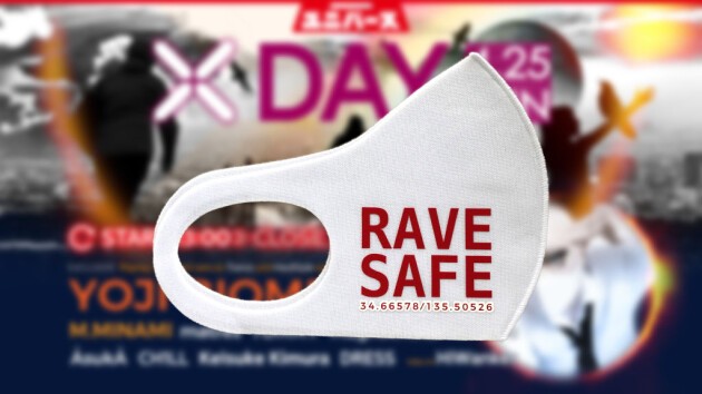 X DAY ではマスクの着用をお願い致します。大阪では4/5より「まん延防止等重点措置」が適用となり、イベントにご参加下さる皆様は安全配慮義務としてマスクの着用が必要です。どなた様もマスクのご持参をお忘れなく!また、エントランスではRAVE SAFEロゴ入りのマスクの販売を行います。(数に限りがありますので、売り切れの際は悪しからず御了承ください。)