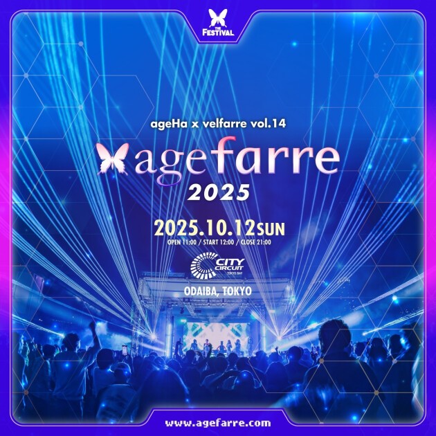 2006年に幕を閉じた伝説的スーパークラブ・velfarre(ヴェルファーレ)と、2022年に新木場での活動を終了した日本を代表するクラブブランド・ageHaがコラボする年に一度のモンスターパーティー"agefarre"(アゲファーレ)が、今年もお台場での野外フェスティバルとして開催!!