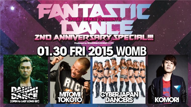 多くのクラウドたちを天高く舞い上がらせてきたDAISHI DANCEのレギュラー・パーティ『FANTASTIC DANCE』。その2015年第一弾は、もちろんDAISHI DANCEがエキサイティングなロングセットを展開。エレクトロニックミュージック界を席巻するEDMや、世界的なフェスブームなどに着想を得て、DAISHI DANCEならではの最新モードをWOMBで表現する。さらに、『FANTASTIC DANCE』の2周年ということで、MITOMI TOKOTOやKOMORIといった盟友が参戦。エレクトロニックミュージック・シーンを牽引する3者が、アグレッシヴなパフォーマンスで魅了する。そして、これまで同様にCYBERJAPAN DANCERSも登場。DAISHI DANCEとその仲間たちが、この日でしか成し得ないファンタスティックなパーティを届ける!!