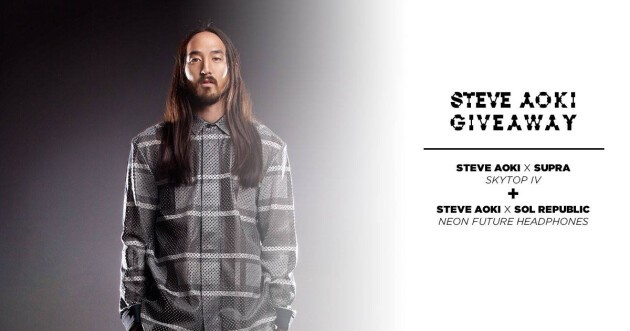 その商品は、Steve AokiがSUPRAとコラボしたSKYPTOP IV型のシューズとNeon Future型のSOL Republicのヘッドフォンがあたる。