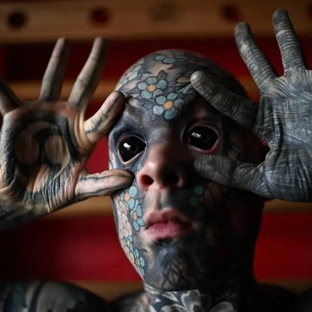 Sylvain Helaine さんは「Freaky Hoody」として知られており、体、顔、舌等の全身ににタトゥーを入れており、眼球を黒いインクで染める施術も受けている。なお、この施術を行うことはフランスでは違法であるため、彼はスイスに旅行してこの施術を460時間に渡って受けたとのことだ。