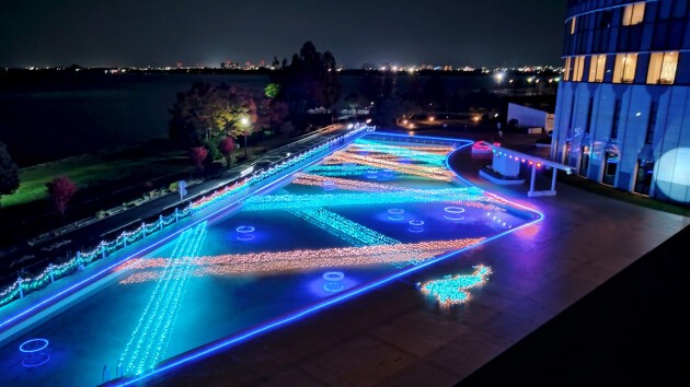さらに、施設内の屋外プールは、全長90mのプール水面の反射を利用したブルーとゴールドの LED のライトアップが、地上からでも客室からでも見る角度により違った印象で楽しむことができる。