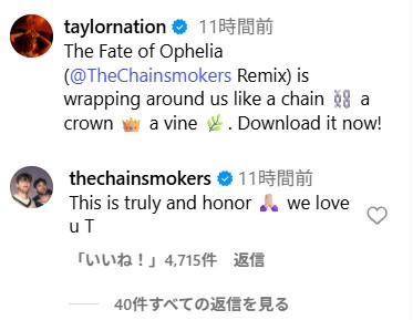 アメリカ出身の大人気 DJ / プロデューサー デュオ The Chainsmokers(ザ・チェインスモーカーズ)が、Taylor Swift(テイラー・スウィフト)が2025年10月にリリースした12枚目のアルバム『The Life of a Showgirl』のリードシングル "The Fate of Ophelia" のリミックスを手掛けた事が明らかになった。