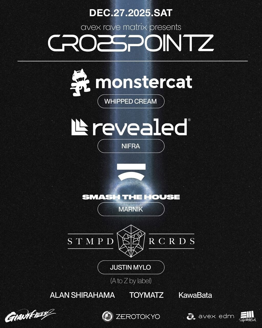 そして第3部となる23:00〜スタートの『avex rave matrix presents “CROSSPOINTZ”』は、世界トップダンスレーベルが一堂に会する一夜限りの祭典に! 世界の最前線を走り続ける4大ダンスレーベル Monstercat(モンスターキャット)、Revealed Recordings(リビールド・レコーディングス)、Smash The House(スマッシュ・ザ・ハウス)、STMPD RCRDS(スタンプド・レコーズ)※ が一挙集結するという、世界でも類を見ない“奇跡の夜” が新宿 ZEROTOKYO にて開催される。※ A to Z by label