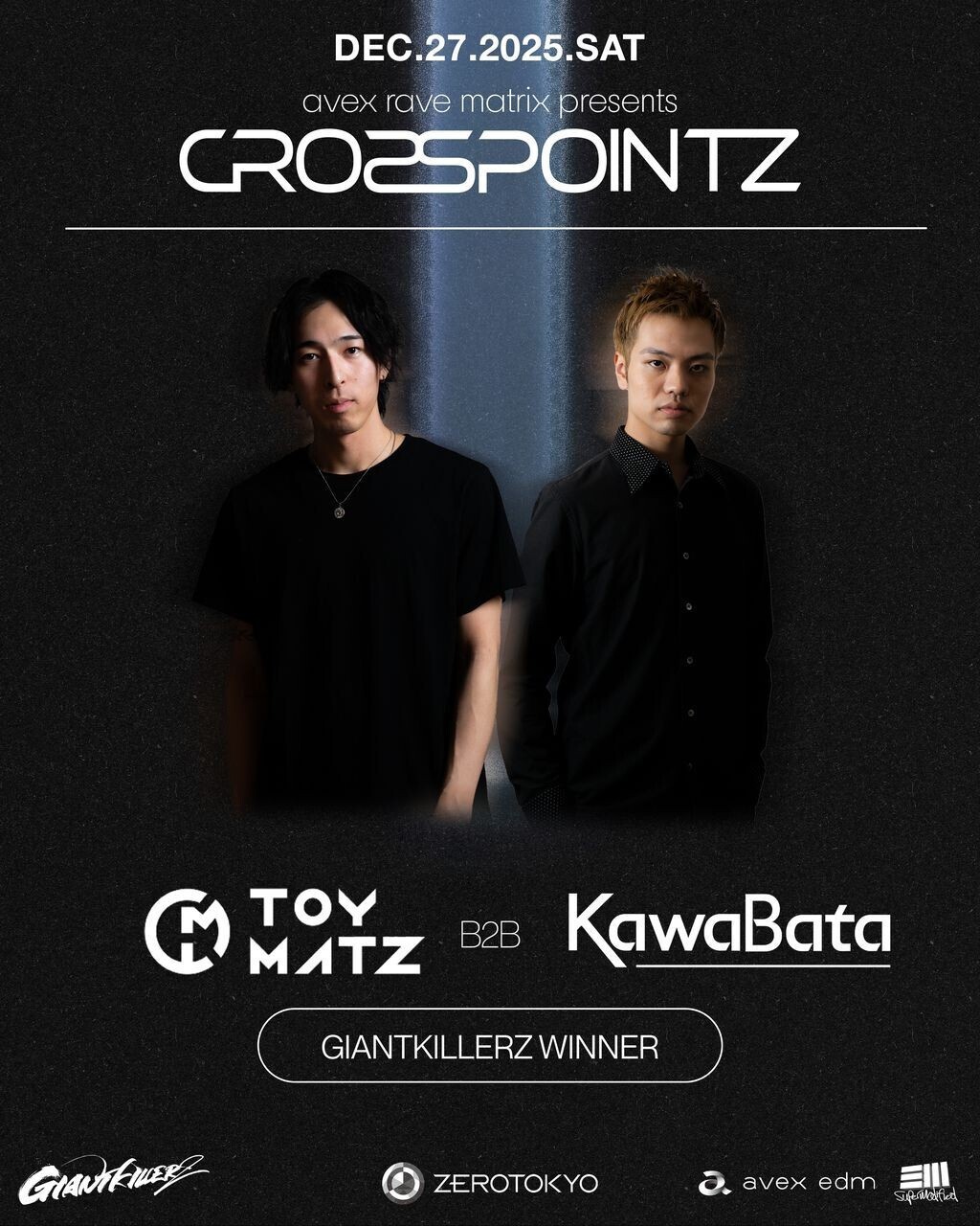 そして avex と Nicky Romero(ニッキー・ロメロ)主宰レーベル Protocol Recordings がタッグを組んでローンチした、日本のダンスミュージック・シーン最大規模の次世代 DJ/アーティスト発掘・育成プログラム「GIANTKILLERZ(ジャイアントキラーズ)」より、2024年度優勝の TOYMATZ(トイマッヅ)、そして2025年度優勝の KawaBata(カワバタ)が、B2B にて共演を果たす。