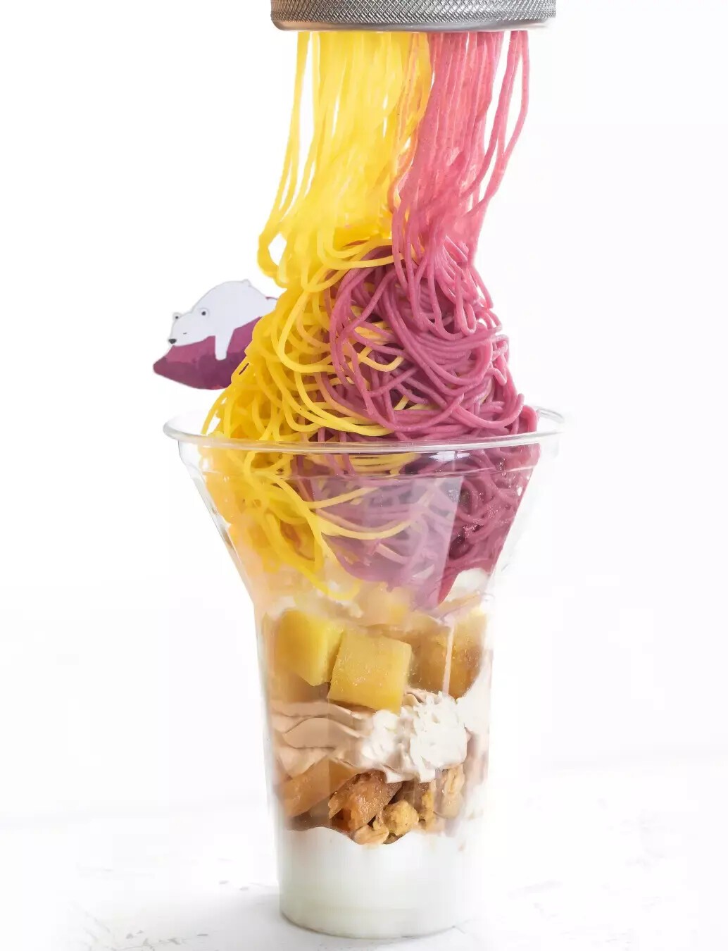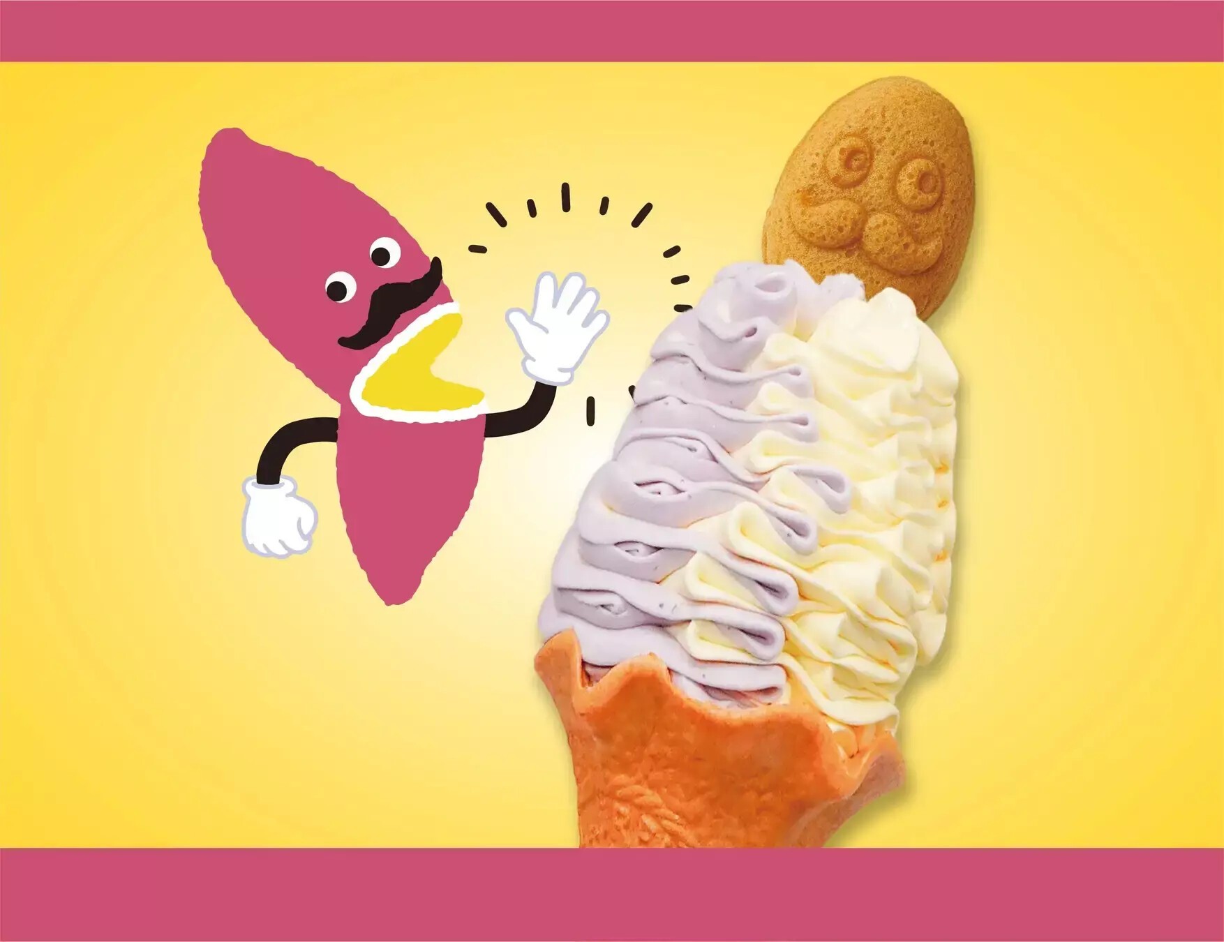 やきいもの妖精「焼き右衛門」型のおいもカステラがのった、安納芋×紫芋の華やか&濃厚なおいもソフトです。