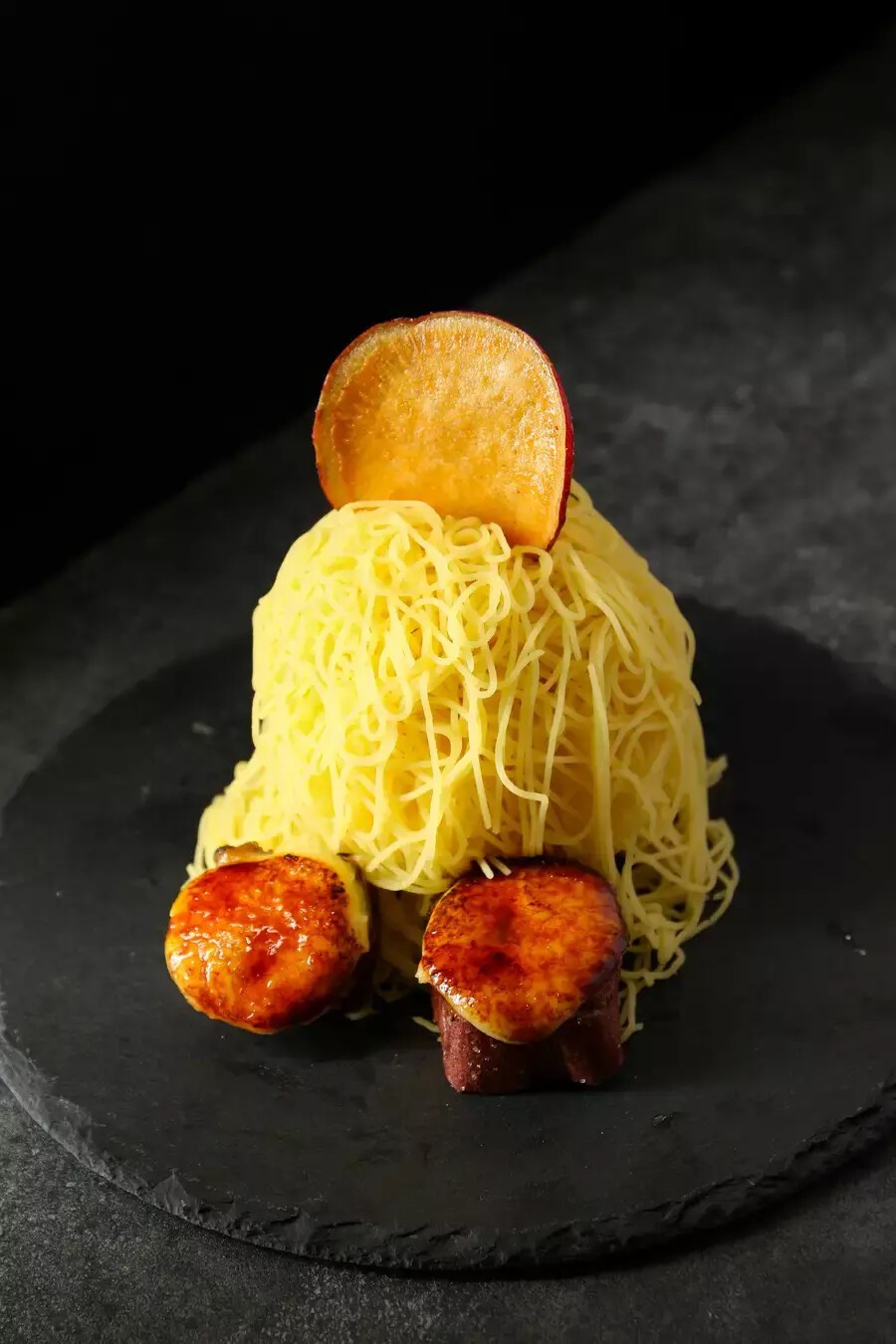 カットした金蜜芋にバニラアイスをのせ仕上げに1mmモンブランを繊細にまとわせました。一口ブリュレとの相性抜群!