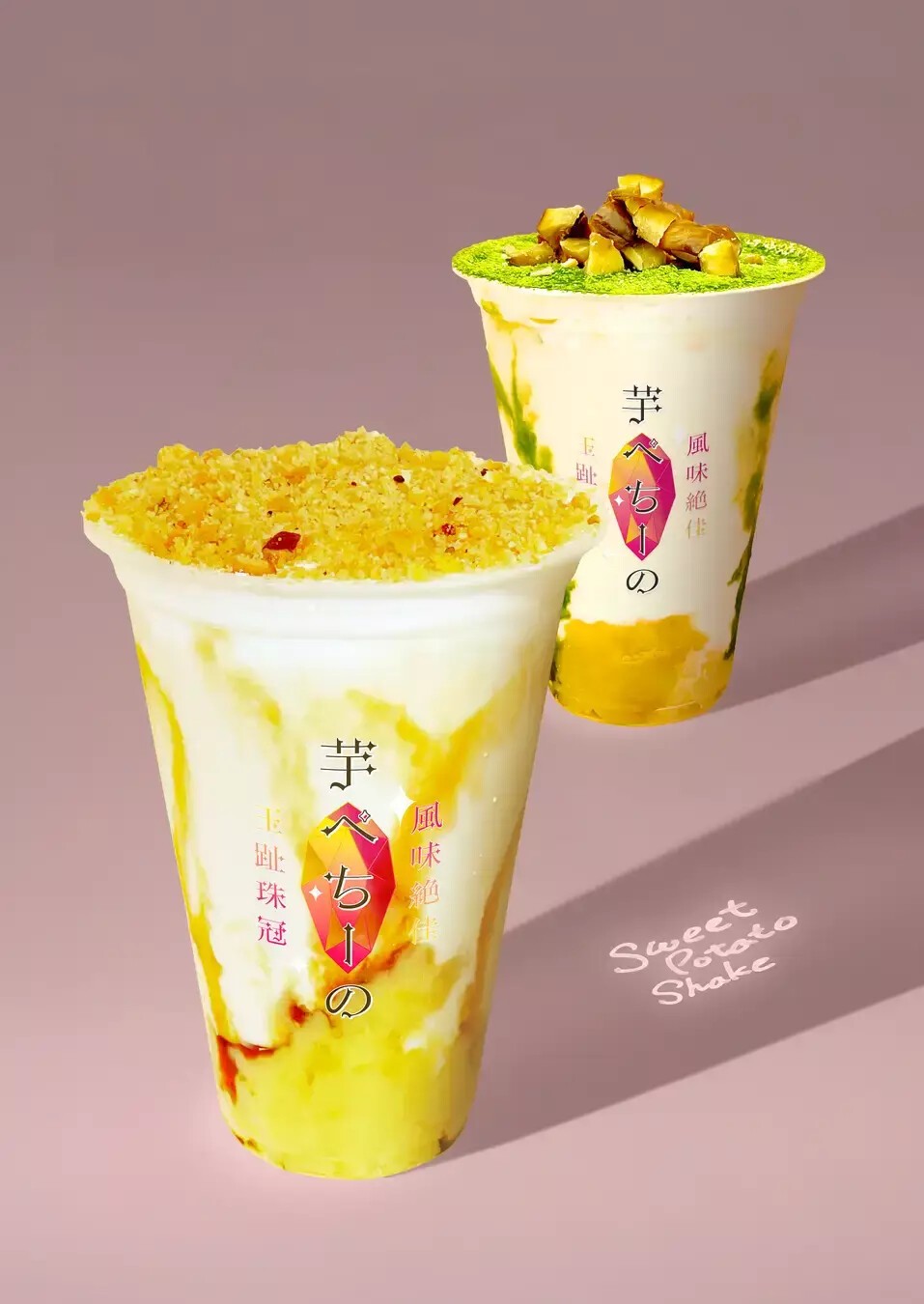 千葉の素材がおいしく響き合う芋ぺちーの。香取市の焼き芋で作る濃密シェイクに、千葉落花生のカリッと香ばしいアクセント。(トッピング:栗抹茶/ロイヤルチョコもあり)