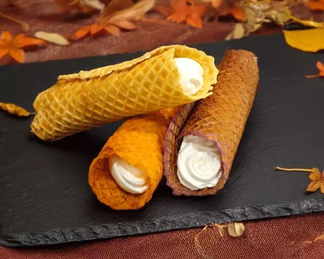 ~生地はさつまいも100%・小麦不使用~小麦粉不使用でおいも100%のワッフル生地にクリームを入れたおいものコロネです。