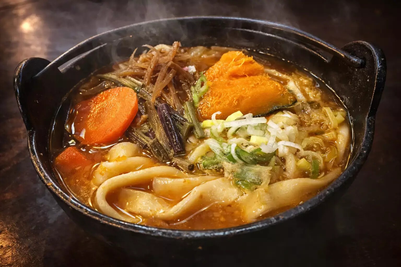 富士山麓のおいしい水をふんだんに仕込み水に使った、もっちりとした自慢の麺。山梨県の郷土料理として長く愛されてきた素材の旨みそのままに仕上げました。かぼちゃをはじめとするたっぷりの野菜を、コク深い味噌でじっくり煮込んだ一杯は、体の芯まで温まります。自然の恵みと受け継がれてきた食文化が織りなす、山梨の誇り、本場のほうとうを、ぜひお楽しみください。