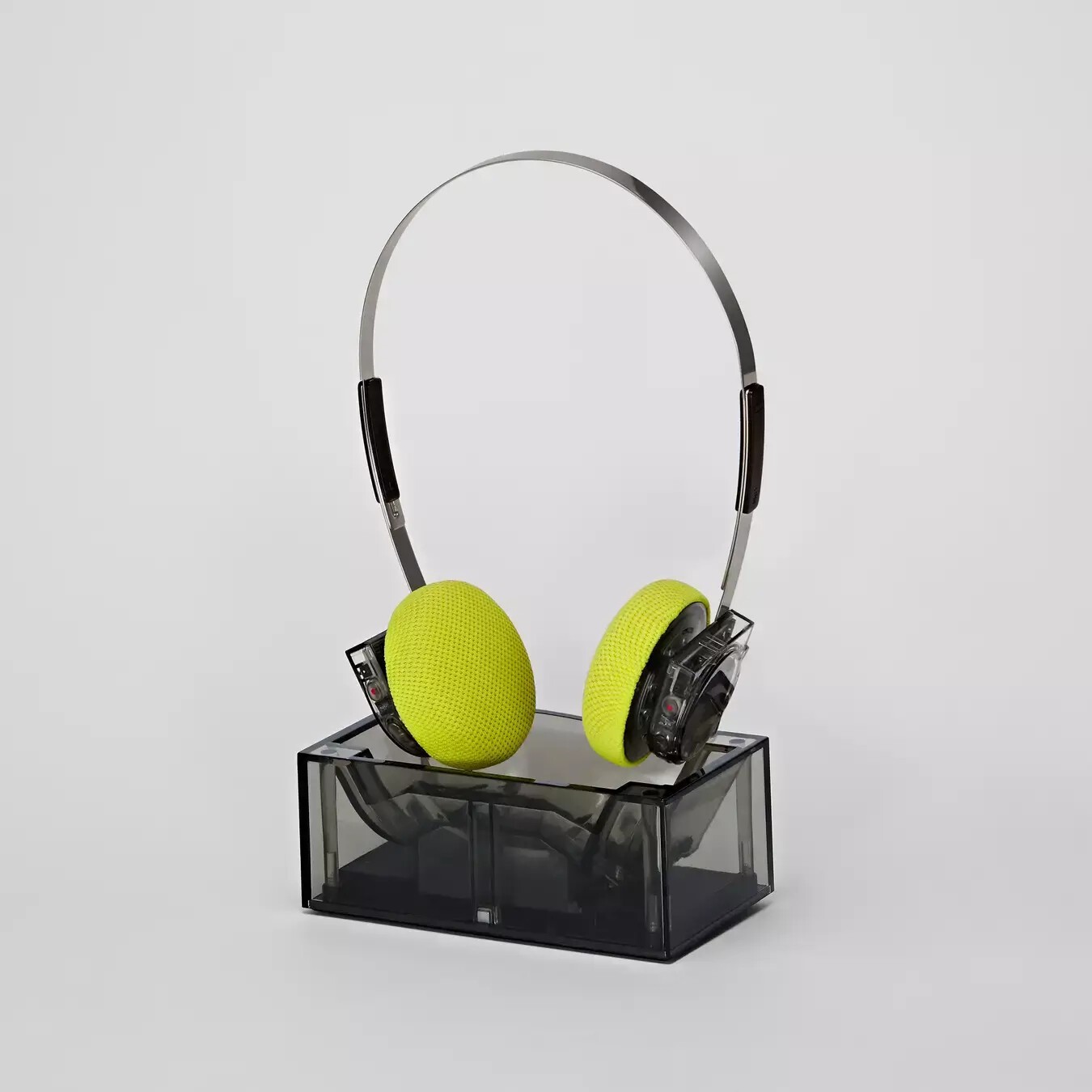 圧倒的な軽さを誇る Hp1。ハウジングが「クリア」になり、内部構造が露出。そこに「ライムイエロー」のイヤーパッドが付属します。この組み合わせは、ストリートファッションやテックウェアとの相性が抜群。