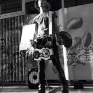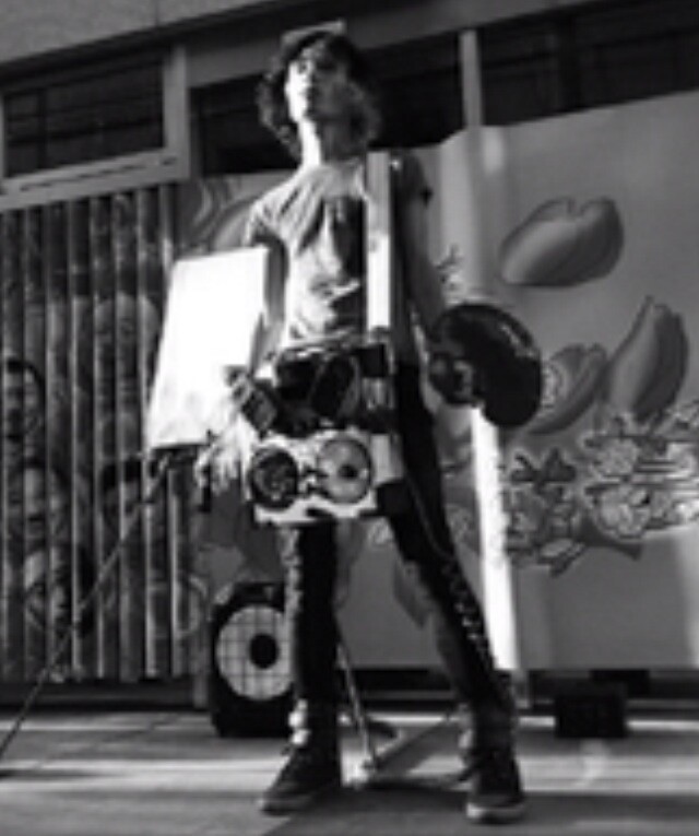 DJデッキを肩からさげ、リズムに乗りながらスピーディーに絵を描く。