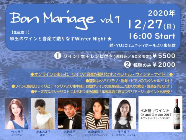 Bon Mariage (最高の組み合わせ・相性)…音楽とワインのマリアージュを楽しむ贅沢な時間を共有しよう!と2012年から始まったイベントも今年で9回目!毎回満席・大好評をいただいている今回は『珠玉のワインと音楽で織りなすWinter Night』と題し、初のオンライン開催!イタリアワインプレゼンターの厳選ワインをご自宅にお届けし、そのワインのお話やワインに合うチーズオードブルなどもご紹介。当日はイタリアの生産者とライブ中継で繋いで、直接栽培や熟成のこだわりを伺います!そして、ゆっくりワインを味わいながら、“メゾソプラノ×揚琴×ピアノ”の異色トリオのアンサンブルをお楽しみください♪何かとせわしなかった2020年、自分へのご褒美に、師走のひと時美味しいワインと音楽を楽しみませんか?