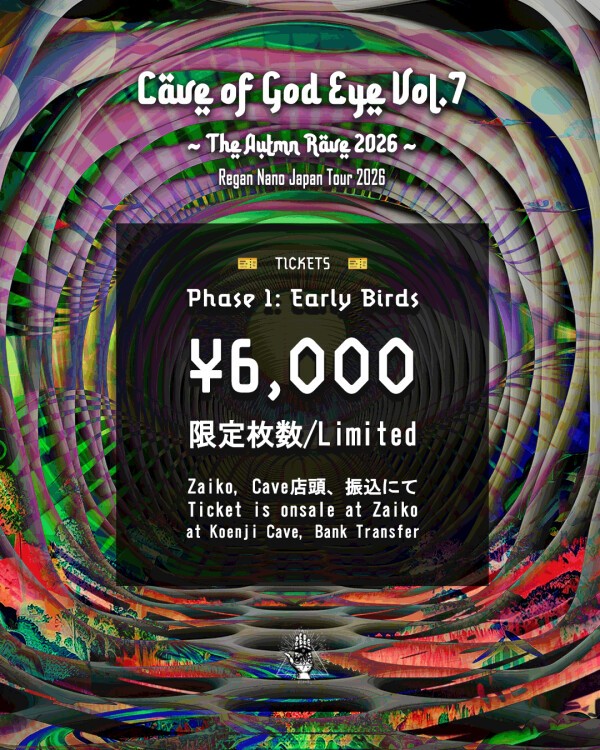 Koenji Cave, which has continued to stand at the forefront of Psychedelic Trance, presents its autumn outdoor rave, Cave of God Eye Vol.7. For 25 hours from September 19–20, 2026, we return to our usual location for a non-stop rave featuring simple yet deep spatial production and uncompromising sound.