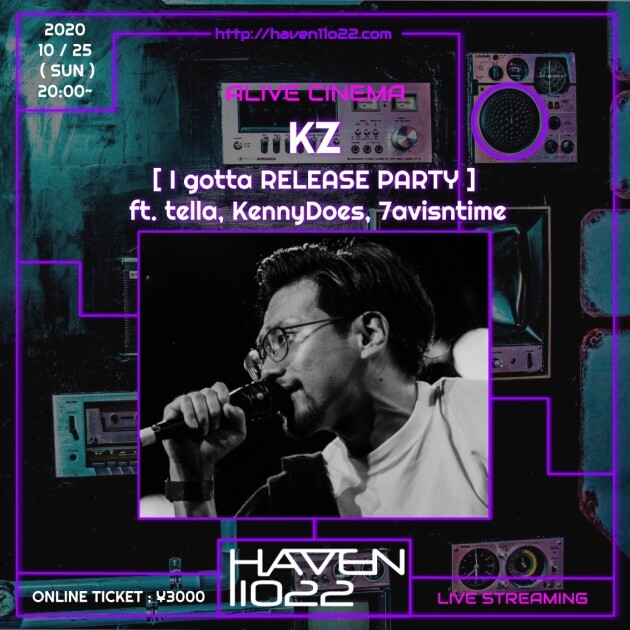 10月21日「KZ」待望の4曲入りEPリリース!その描き出す世界は限りなくメロウで、オンリーワン。梅田サイファーで話題を呼ぶ、KZの魅力が散りばめられた最高なサウンドをお届けするスペシャルなALIVE CINEMA!さらに tella, KennyDoes, 7avi sntimeのSOLO LIVE SETもあり!