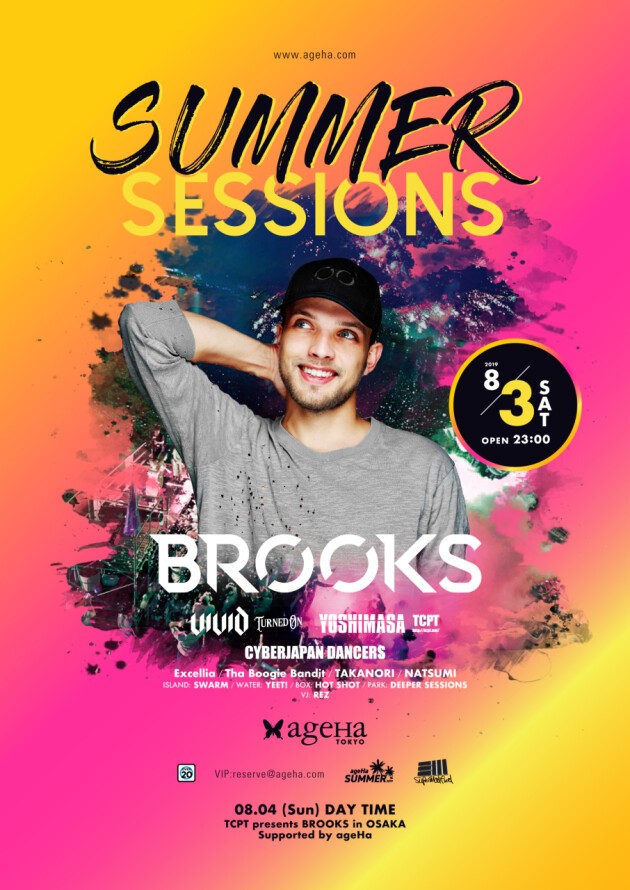 初のヘッドライナーとしての来日となる今回は、LUMBERJACKやWHITE PARTYなどコンセプチュアルなパーティーでお馴染み、海外レーベルからもリリースを重ねるVIVIDが率いる”TURNED ON”と、ageHaを中心にビッグパーティーを展開し続けるYOSHIMASA率いる”TCPT”がコラボ、双方待望のゲストアーティストとしてBROOKSを迎える!