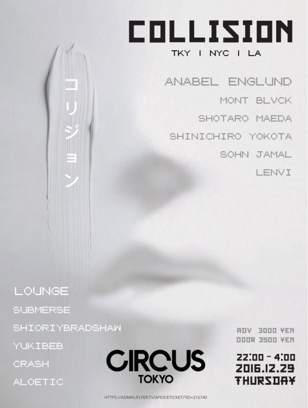 COLLISION is a cross-cultural music event that bridges the underground music scenes of TKY x LA x NYC. We are bringing you a killer lineup with cutting-edge artists who are pushing the boundaries of their art. Excited to announce our headliner Anabel Englund (Defected / Three Six Zero Music) who has collaborated with high profile house music DJs including Lee Foss, Jamie Jones, Luca C, & Ali Love. She played a pivotal part in the success of Pleasure State with Lee Foss and MK, LA-based singer/songwriter. Closing the night, we have house legend Shinichiro Yokota who founded FAR EAST Records with fellow house legend, Soichi Terada. Our lounge floor lineup will feature FUTURE BEATS, R&B, ELECTRO sounds from artists including world renown beatmaker submerse (Airflex Labs) and Soulection's Tokyo-born Yuki Beb. Grab your friends and come dance the night away!!