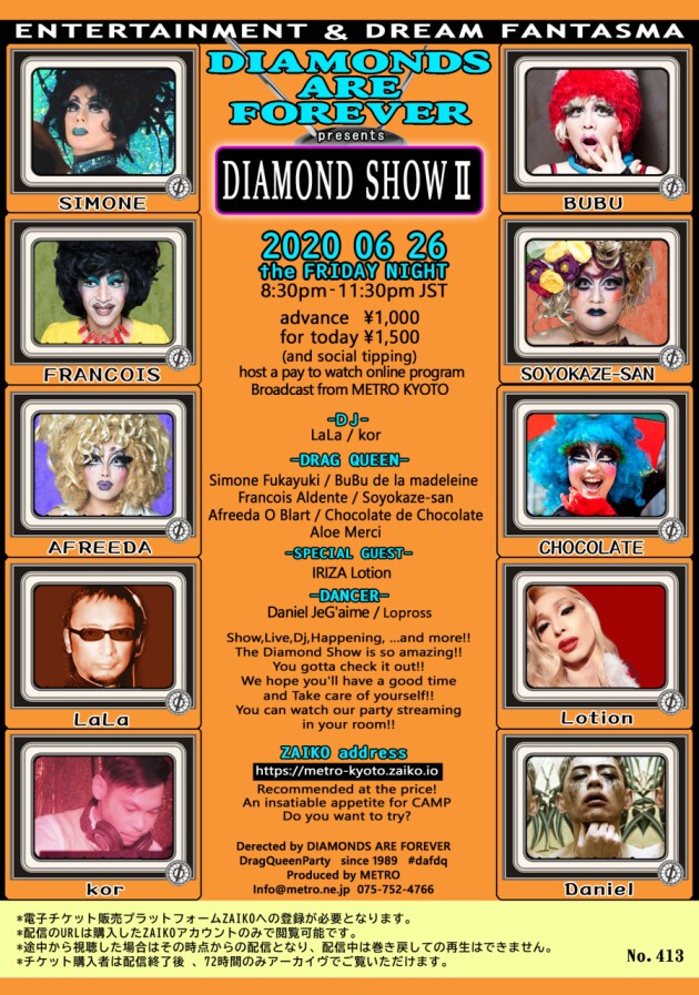 1990年のCLUB METRO創業時より、毎月最終金曜日の夜に、30年間も開催され続けている驚異のロングランパーティー"DIAMONDS ARE FOREVER"が、配信バージョンで送る第2弾 !!