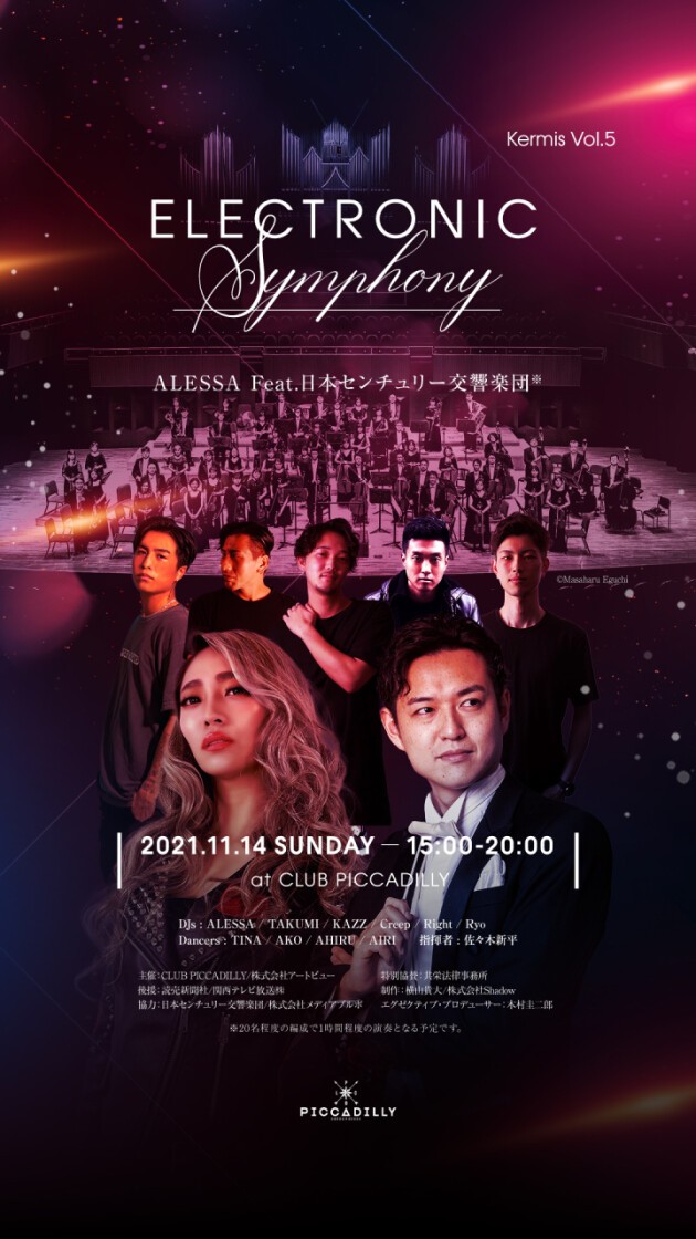 【Electronic SymphonyTM】 ダンスホールでDJによって奏でられるEDMと交響楽団の協演をテーマとしています。 タイムテーブル15:00-18:35はDJとダンサーの公演となり、ALESSAと日本センチュリー交響楽団の公演は18:35-20:00となります。