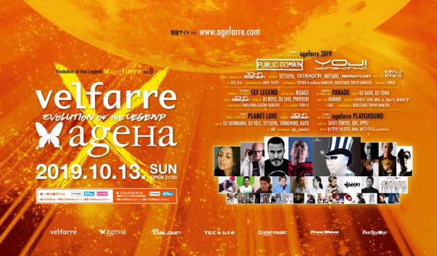 2006年に幕を閉じた伝説的スーパークラブvelfarreと、日本を代表するエンターテイメントスペース新木場ageHaがコラボレーションする年に一度のモンスターパーティー"agefarre"(アゲファーレ)!