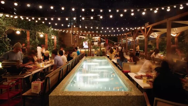 『ルーフトップBBQ』は、圧巻の星空と煌めく夜景を臨む都市型 BBQ。大阪ミナミの夜景が一望できる全席カップルソファの2名専用プレミアムエリア、開放的なオープンエアのプールサイドシートや半個室シート、仲間と楽しむカリフォルニア BBQ エリアなど、昼から BBQ が楽しめ、多彩な利用シーンに対応した都市型ビアガーデンだ。
