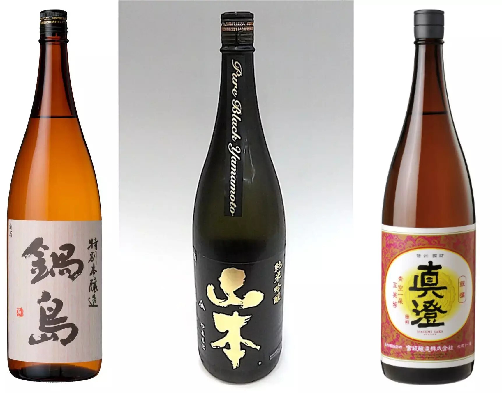▼ 左から:鍋島 特別本醸造、 山本 Pure Black ピュアブラック、 銀撰 真澄