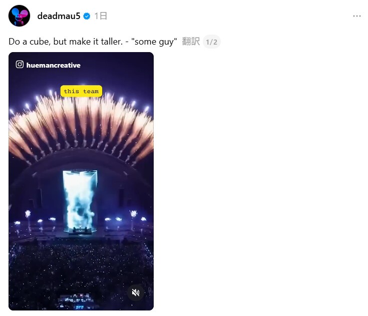 deadmau5 は Threads に David Guetta の「The Monolith」の動画を貼り付け「Cube を作れ。ただし、もっと縦にしろ - "どこかの誰か"」というキャプションを添えている。