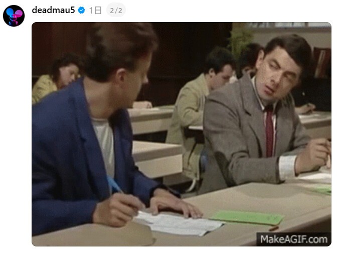 更に上記の投稿に次ぐコメントとして、イギリスで放送されたコメディドラマの主人公ミスタービーンの有名なオープニング・スケッチの GIF 画像も投稿。ミスタービーンが試験中、監督者の視線を避けながら隣の生徒の答案を必死にカンニングしようとするシーンのものだ。つまり deadmau5 は、2010年に初登場した自身の革新的な「Cube」プロダクションのデザインが David Guetta のプロダクション・チームによって模倣されたと、公に主張しているようだ。