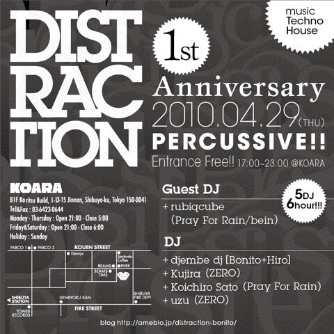 2009年→確実な偶然で繋がった同志と共に、自身がオーガナイズするコンセプチュアルパーティー[DISTRACTION]を3/14渋谷KOARAにて始動。