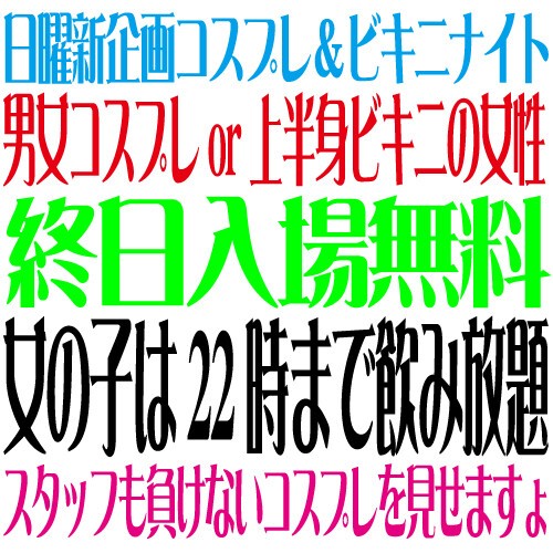 男女コスプレ&上半身ビキニのお客様は終日入場無料!