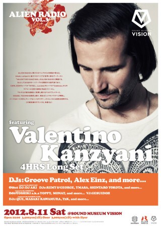 前回、DAVE CLARKEをフィーチャーし、爆発的な動員と、そのトップクオリティーのパーティー感を見せつけたALIEN RADIOに再びスロベニアからの刺客が現れる!Umek、Laibachと並びスロベニアが世界に誇るアーティスト” VALENTINO KANZYANI”がALIEN RADIOに降臨する。DJとしては3台のターンテーブルを駆使する技巧派であり、CARL COXのレーベル”INTEC”、 Lucianoのレーベル”Cadenza”からのラブコールを受け良質な作品をリリースし、マルチな才能を遺憾なく発揮し続けるマルチプレイヤーだ。HOUSE、TECHNOを探求し続け、現在はミニマルハウスへと傾倒し、ハードなビートの中にディープなシンセサイザー、オリエンタルな音色を使用する。この最先端のサウンドを、体感せよ!!