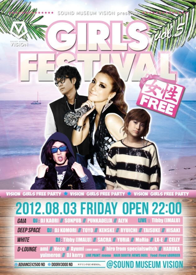 7月の七夕に引き続きVISIONの華麗なる一夜”GIRLS FESTIVAL”が再び開催される。今回のラインナップも全てのFEMALE MUSIC LOVERに捧げる出演者がラインナップされている。過去DJとして出演しているTibby (IMALU)がLIVEを敢行。そしてVISIONでもおなじみのSONPUB、PUNKADELIX、ALYNのELECTRO DJ達がそこに華を添える。DEEP SPACEでは、R&B MIX シリーズで脅威のセールスを記録し続けるDJ KOMORIを筆頭にメロウなR&B、HIP HOPが優しく包み込む。2012年の夏の思い出の1ページにGIRLS FESTIVALが加わるであろう。
