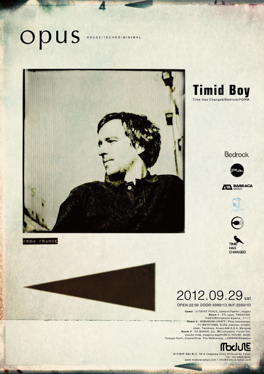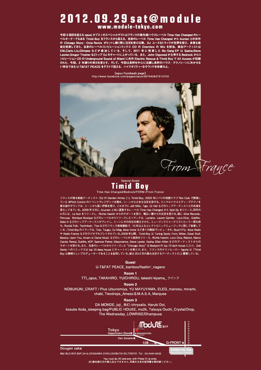今回5回目を迎えるopus(オプス)のスペシャルゲストはフランスの最先端ハウスレーベルTime Has ChangedのレーベルオーナーでもあるTimid Boyをフランスから迎える。自身のレーベルTime Has ChangedからAumenとの共作のChicago Story - Oxia Remixがヒットし瞬く間に注目を受け以降、DJユースなトラックが定評を受け、良質な楽曲を発表してきた。自身のレーベルコンピレーションミックスCDのOverviewのMixを担当、参加アーティストはKiki,Carlo Lio,Glimpseなどが参加している。そして、2011年に発表したMy Gang EPはSasha,Steve Lawler,Gregor TresherなどトップDJのチャートに上がっている。また、John Digweedが主宰するBedrockからコンピレーションCDのUnderground Sound of Miamiに共作Electric Rescue & Timid BoyでAll Accessが収録された。今回、2年振りの来日を果たす。