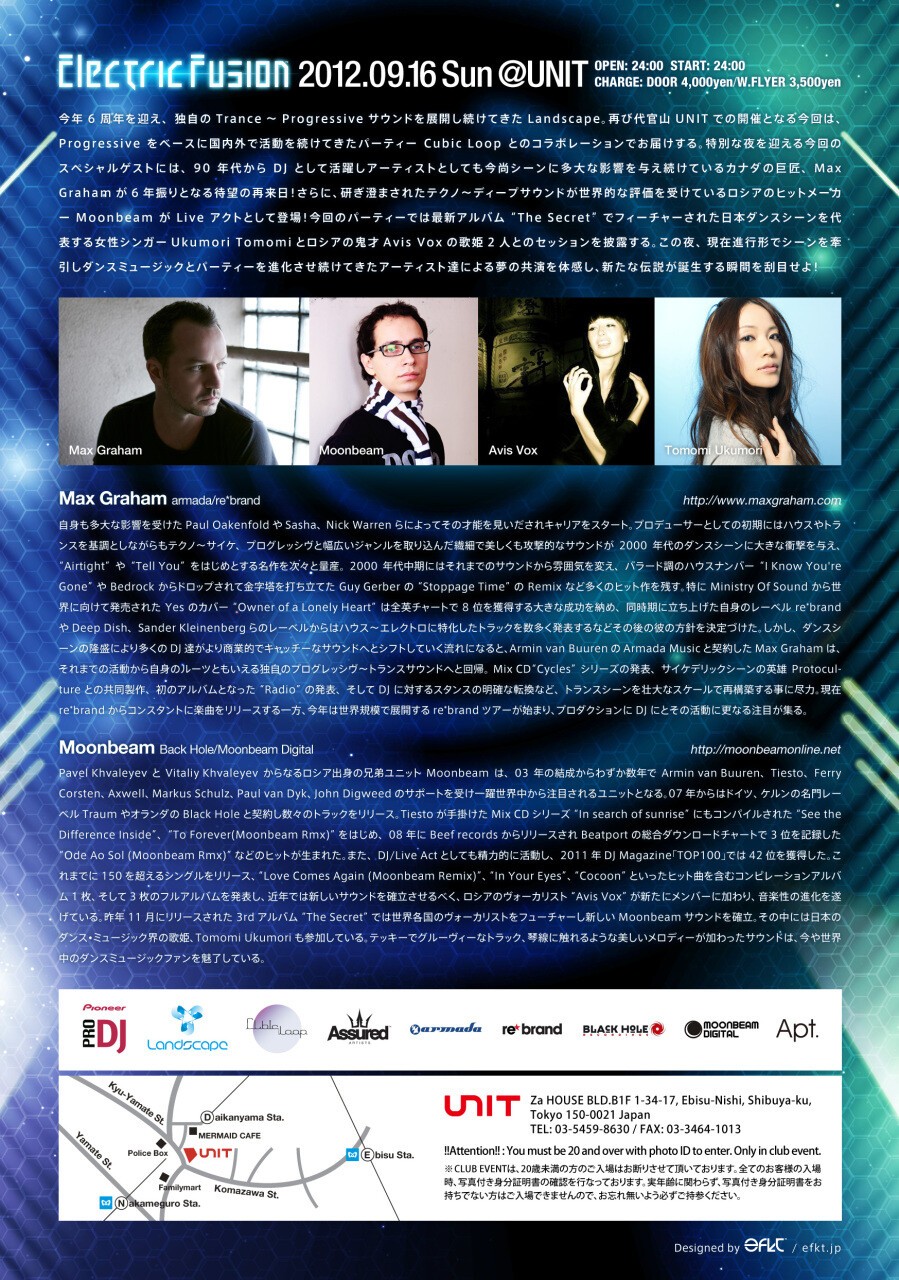 今年6周年を迎え、独自のTrance~Progressiveサウンドを展開し続けてきたLandscape。再び代官山UNITでの開催となる今回は、Progressiveをベースに国内外で活動を続けてきたパーティーCubic Loopとのコラボレーションでお届けする。特別な夜を迎える今回のスペシャルゲストには、90年代からDJとして活躍しアーティストとしても今尚シーンに多大な影響を与え続けているカナダの巨匠、Max Grahamが6年振りとなる待望の再来日!さらに、研ぎ澄まされたテクノ~ディープサウンドが世界的な評価を受けているロシアのヒットメーカーMoonbeamがLiveアクトとして登場!今回のパーティーでは最新アルバム“The Secret”でフィーチャーされた日本ダンスシーンを代表する女性シンガーUkumori Tomomiとロシアの鬼才Avis Voxの歌姫2人とのセッションを披露する。この夜、現在進行形でシーンを牽引しダンスミュージックとパーティーを進化させ続けてきたアーティスト達による夢の共演を体感し、新たな伝説が誕生する瞬間を刮目せよ!