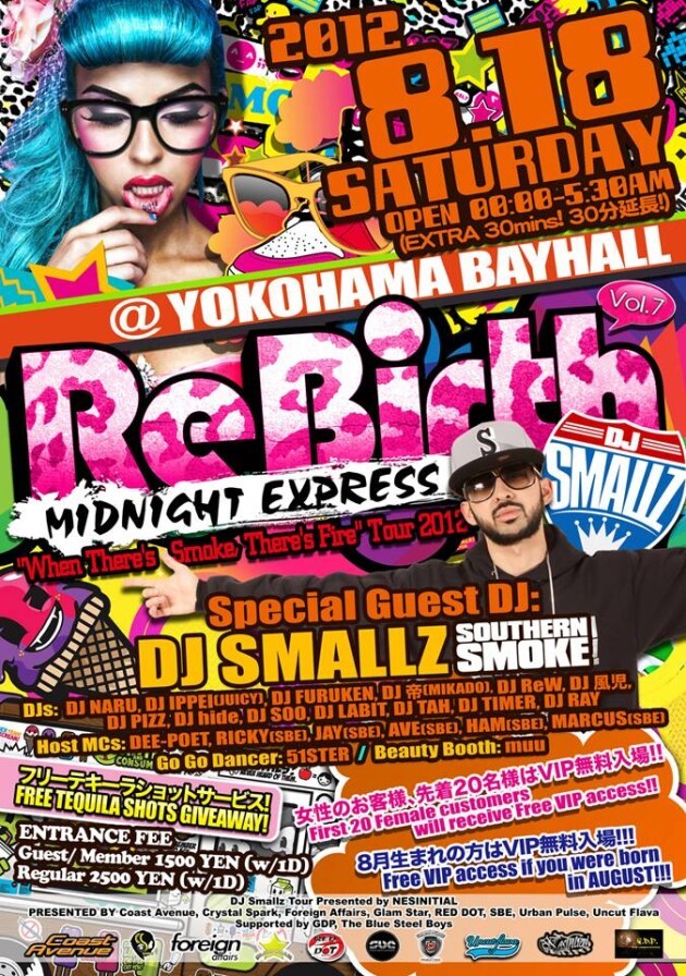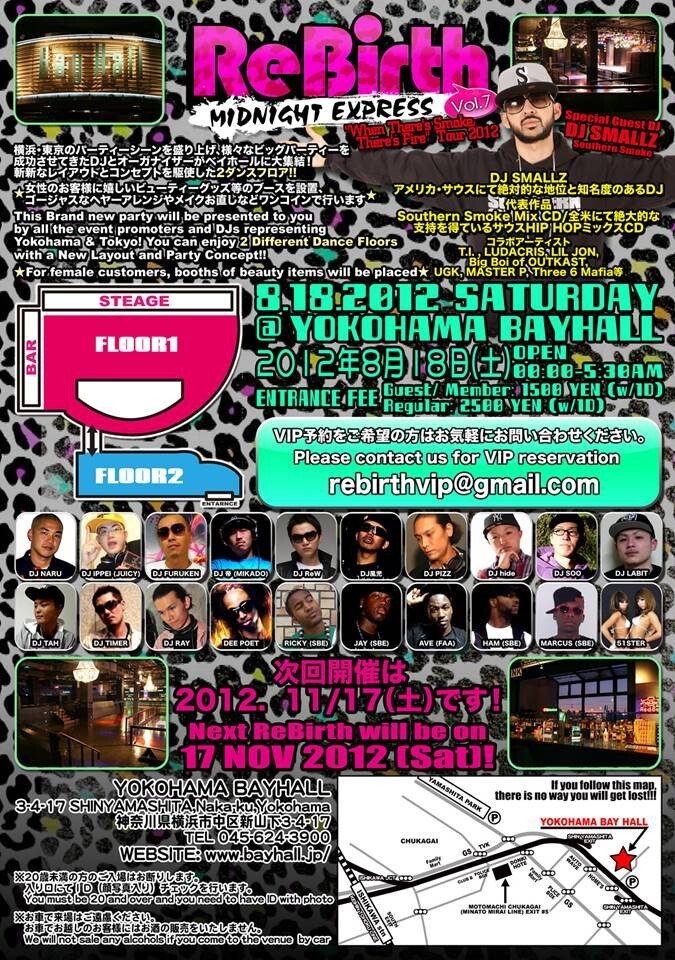 (8/18 土)横浜ベイホール最新ビッグイベントReBirth/ MIDNIGHT EXPRESS開催。2ダンスフロア! 横浜・東京を代表するDJ大集結! SBEディスカウント1500円1ドリンク付!
