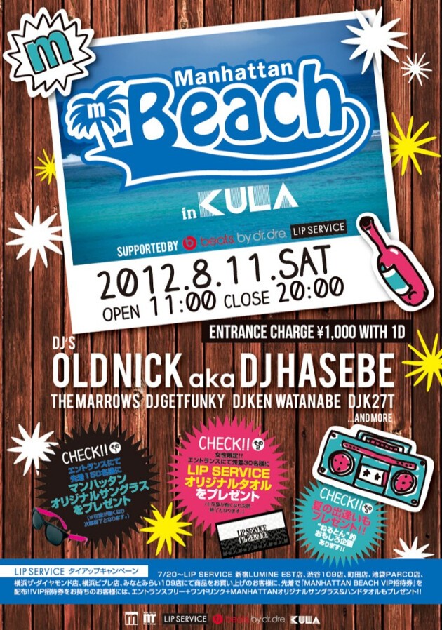 7/20?LIP SERVICE(新宿LUMINE EST店、渋谷109店、町田店、池袋PARCO店、横浜ザ・ダイアモンド店、横浜ビブレ店、みなとみらい109店)にて商品をお買い上げのお客様に、先着で『Manhattan Beach VIP招待券』を配布!! VIP招待券をお持ちのお客様には、エントランスフリー+ワンドリンク+Manhattanオリジナルサングラス&ハンドタオルもプレゼント!!