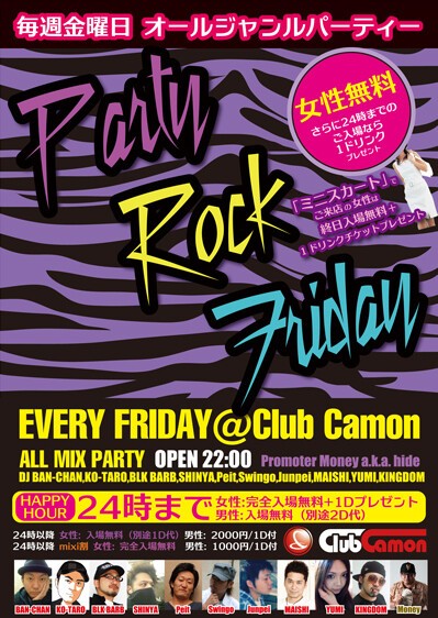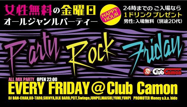 金曜カモンのオールジャンルイベント☆DJも人気オールジャンルDJが大集結!!R&B やHIP HOP、REGGAEやTOP40〜ELECTROまで様々なジャンルを楽しめるのでCLUB初心者でも安心して楽しめちゃいます!!タイトルからも伝わるように「とにかく金曜なんでPARTYしよう!!そんな「みんなで仲良く楽しんじゃう♪」のがこの「Party Rock Friday」!!DJはお馴染みの人気のこの2人、DJ BAN-CHANとDJ KO-TAROの間違いないタッグを筆頭にグランカフェ、ジラフ、オンジェム、ジュール、プラチナム etc...の関西主要大箱クラブで日々「メインPLAY」を任されている人気DJが金曜はカモンに大集結★みんなが知ってるオールジャンルな選曲を時には「映像と一緒に楽しめる」他はマネを出来ない「最先端なオールジャンルイベント」それがこの「Party Rock Friday」!!!!