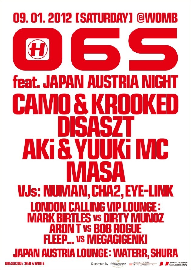 更に加速をし続ける WOMB の最速人気BPMパーティー 06S! 今月の 06S は、オーストリア大使館のサポートにより、日本とオーストリアの友好国関係をレペゼンします!もちろんゲストにはオーストリアから今大注目の CAMO&KROOKED と、オーストリアのドラムンベースを牽引する DISASZT が登場!Reinhard Rietsch と Markus Wagner による “Camo & Krooked” は、瞬く間に「ヨーロッパで最も熱い」と言われる程、業界の話題を集めた。昨年 Hospital Records と契約を果たし、Drum & Bass Arena Awards 2011 にて“Best Producer”、“Best Video” と “Best Album” の3つの賞を授与する快挙を遂げた。新星のように現れた2人はフロアのアンセムを常に制作し、Hospital Records からリリースした大ヒットシングル “Turn Up The Music” に続き、2011年の秋には “Climax”、そして彼らの 1st アルバム “Cross The Line” をリリースした。そのアルバムにはリードシングルとして、 “All Fall Down (feat. Shaz Sparks)” や “Make The Call (feat. TC)”? が収録された。近年では “Cross The Line” のリミックスアルバムを作ると同時に、“Fifteen Years Of Hospital Records” の為に “Reminsce” という楽曲も制作中。その他にもコンピューターゲーム用の楽曲を提供する等、マルチに活躍をしている。また、MAINFRAME を主宰する DISASZT は、オーストリアの首都ウィーンに拠点を置き、西ヨーロッパ最大のドラムンベースパーティーを8年に渡って開催。ハードなそのプレイスタイルで、ヨーロッパをまたにかけて活動している。そして、在京の外国人チーム LONDON CALLING が、VIP LOUNGE に約1年振りに合流!国際色豊かな 06S になる事間違い無し!