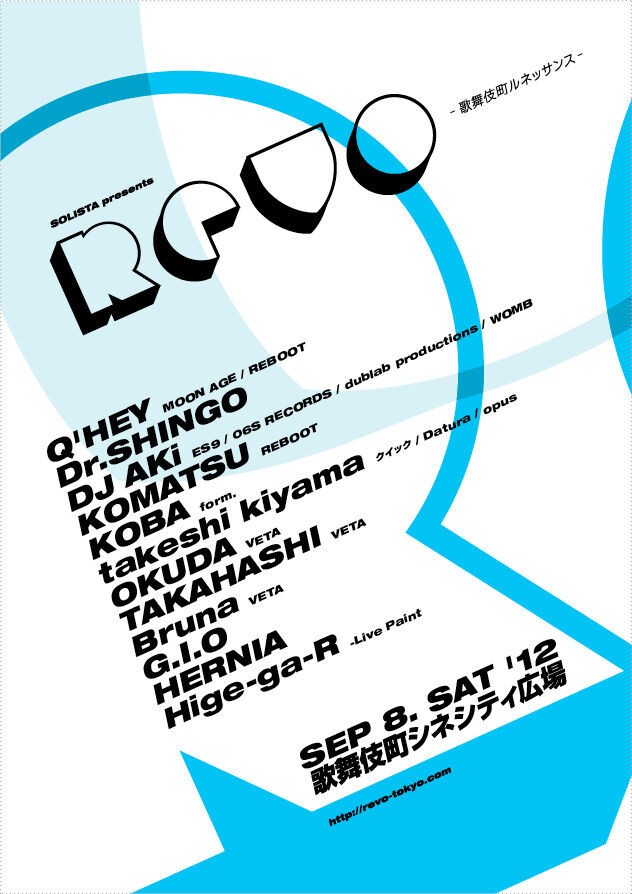 新宿、歌舞伎町で野外テクノフェス「ReVO」開催!! 9月8日土曜日11時?20時、歌舞伎町のど真ん中"シネシティ広場(旧コマ劇前)"に巨大ダンスフロアが出現!