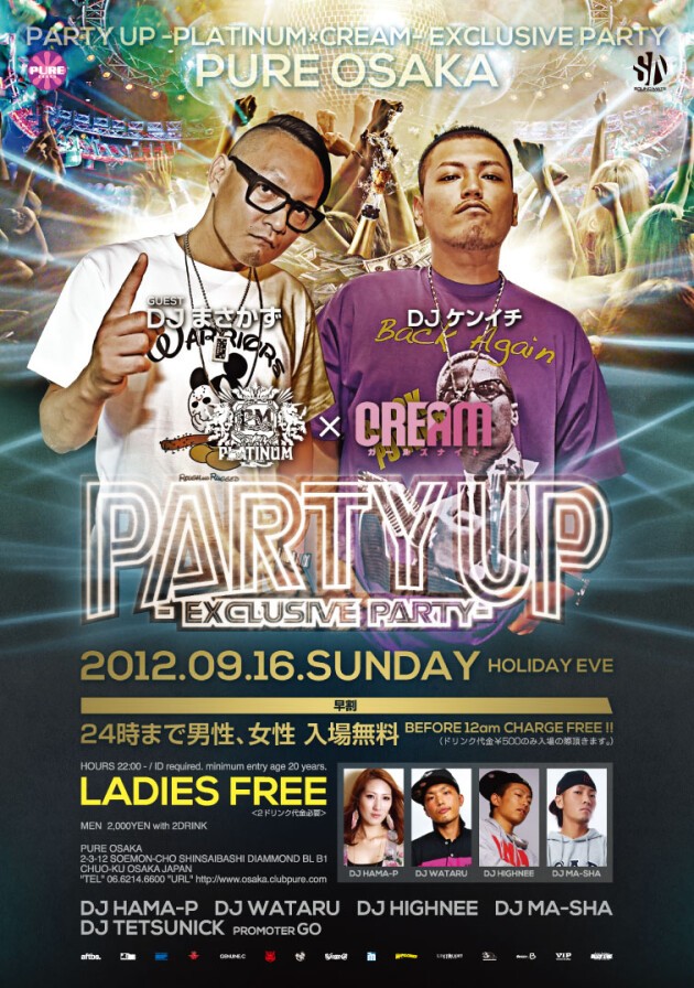 16日(日)の祝前日は火曜日PUREの『CREAM』と第3金曜日Ammonaの『PLATINUM』がコラボ開催!PARTY UPと題しての人気ALL MIX PARTYのコラボレーションNIGHTです! 祝前なのになんと女性は終日無料!24時までに来場の方は早割で更にお得!選曲はHIP HOP, R&B, REGGAEの人気曲から、最新のHIT曲まで納得の行く内容でALL MIXにPALY!場所はオシャレで遊びご心満点な女の子に人気のクラブ・ピュア!誰もが朝まで盛り上がれて楽しめる空間をお届けしますよ。16日は皆でお得にCRAZYに遊んじゃいましょう!祝前はクラブ・ピュアで朝まで飲んで騒いでCRAZYに!!!