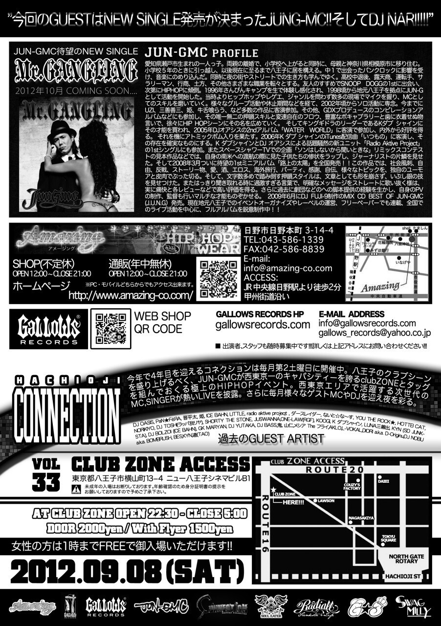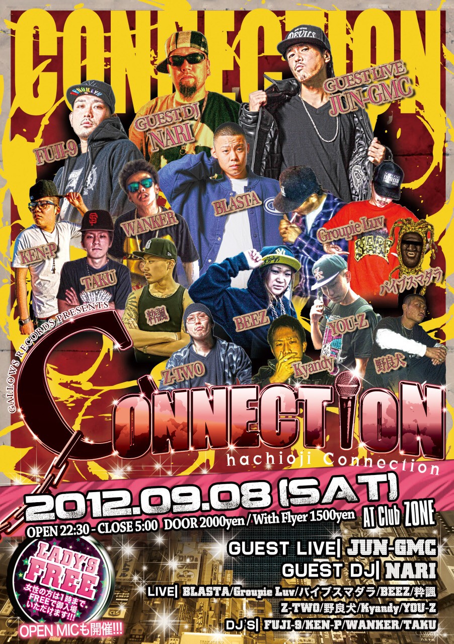 今 年で4年目を迎えるコネクションは毎月第2土曜日に開催中。八王子のクラブシーンを盛り上げるべく、JUN-GMCが西東京一のキャパシティーを誇る club ZONEとタッグを組んでおくる極上のHIP HOPイベント。西東京エリアで活躍する次世代のMC,SINGERが熱いLIVEを披露。さらに毎回様々なゲストMCやDJを迎え夜を彩る。