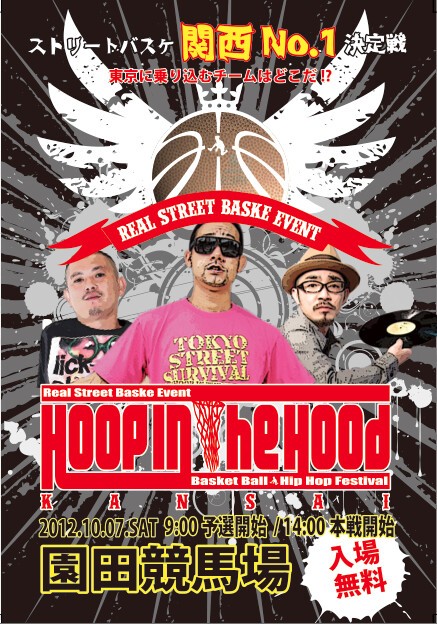 そして今年HOOP IN THE HOOD大阪は関西代表を決める大会へと進化を遂げる!この関西大会を制覇し2013年5月5日東京に乗り込んでくるチームはどこになるのか!?HOOP IN THE HOODに垣根はない、誰でもスポットライトを浴びることが出来る!!なので選手やチーム、沢山のバスケ好きに挑戦して欲しいそして東京行きをゲットして欲しい。そしてプレイヤーだけでなく観客の方々も会場に集まりその目で自分達の地域の代表を確認して欲しい!!!