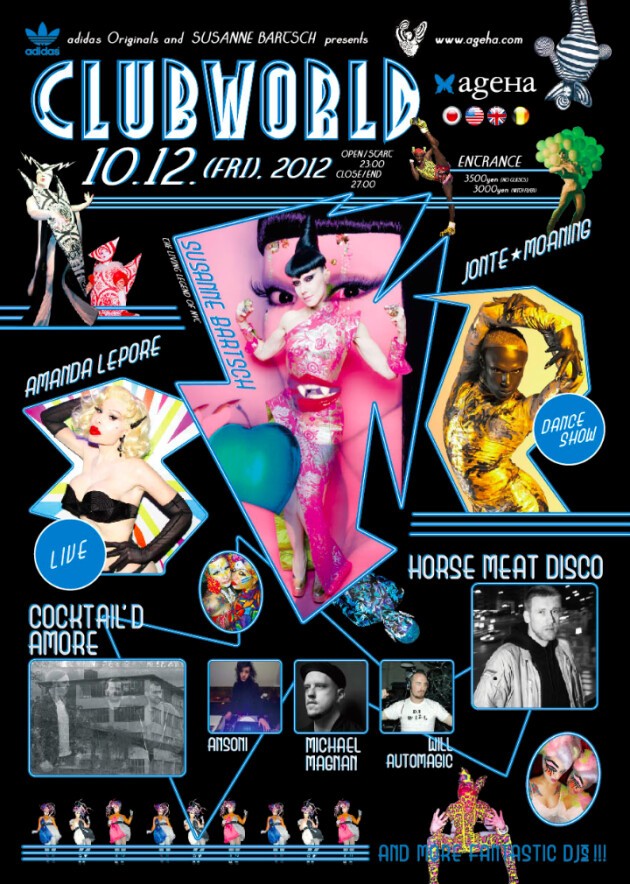NYで最も有名なパーティーオーガナイザーであるスザンヌ・バーチが、音楽、ファッション、そしてカルチャーの新しいプラットフォームを創造するため、アディダス オリジナルスと協力して世界中で開催するCLUBWORLD。 既にNYで開催され、近くヨーロッパでも開催されるこのパーティーが、ここ日本で10月12日にagehaで開催することが決定!