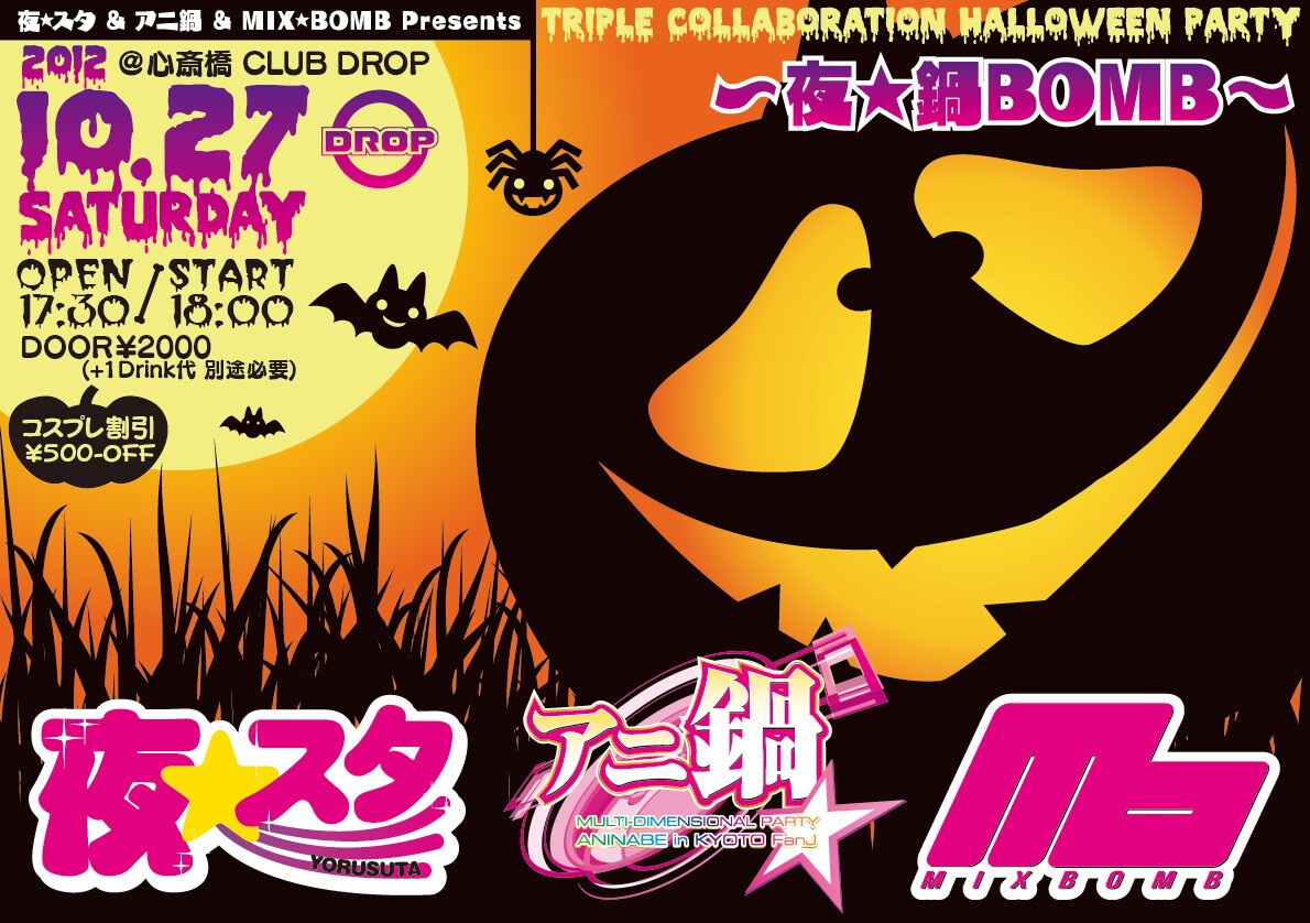 「夜★スタ」「MIX★BOMB」「アニ鍋」3つのそれぞれのイベントカラーを集約し、今回は仮装&コスプレ大歓迎ということで、コスプレ&仮装の方はチケットディスカウント有り★