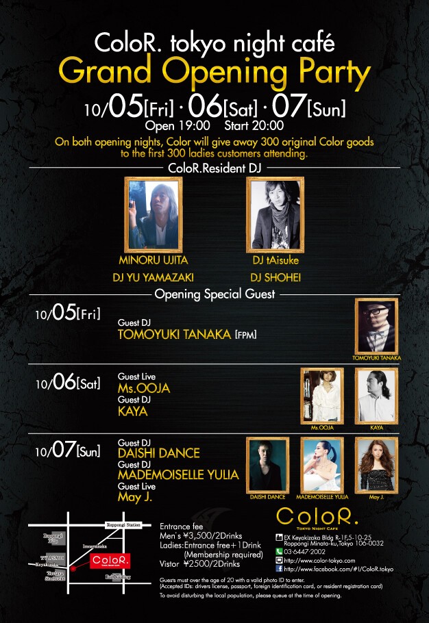 ColoR. tokyo night café Grand Opening Party開催決定! ヘッドライナーにTOMOYUKI TANAKA(FPM),DAISHI DANCE,May J.,Ms.OOJA,MADEMOISELLE YULIA,KAYAなど。
