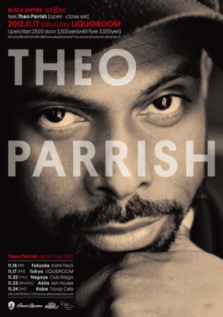 朋友3Chairsの面々や、Moodymannと共に、デトロイト・ハウスというフォーマット上でブラック・ミュージックの伝統を継承し、 そして新たな破壊と創造とともに常にその存在感をアップデートし続ける異才、Theo Parrish。Maurice Fultonとの同地での2年前の共演も記憶に新しい彼がLIQUIDROOMの8周年パーティーのひとつ〈BLACK EMPIRE〉にて、再び降臨する。15年以上に渡って、トラック・メイク、そしてリエデットと共にマイペースながらも強烈な個性を持った作品をリリースし続けているが、やはりそこには彼のDJとしての感覚やプレイからのインスピレーション無しでは語ることはできないだろう。そのプレイの真骨頂はやはりロング・セットだ。ジャズやディスコ、ソウル、テクノ、ハウスが漆黒のグルーヴのなかで混沌と溶け合い、それがひとつの物語として生成され、長き時間を経て去来するロング・プレイは、まるで文字が音へとデコードされてしまった長編小説のようだ。そして今回は、恵比寿の地で8周年を迎え、新たに進化したサウンドシステムにて、オープン?クローズのロングセットが展開される。そのグルーヴによって囁かれる黒き帝国の物語が、フロアの人々のその内なる体験の大地を征服する。